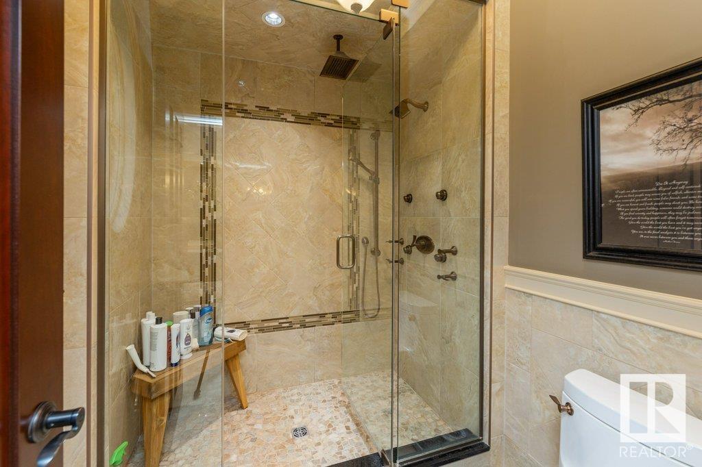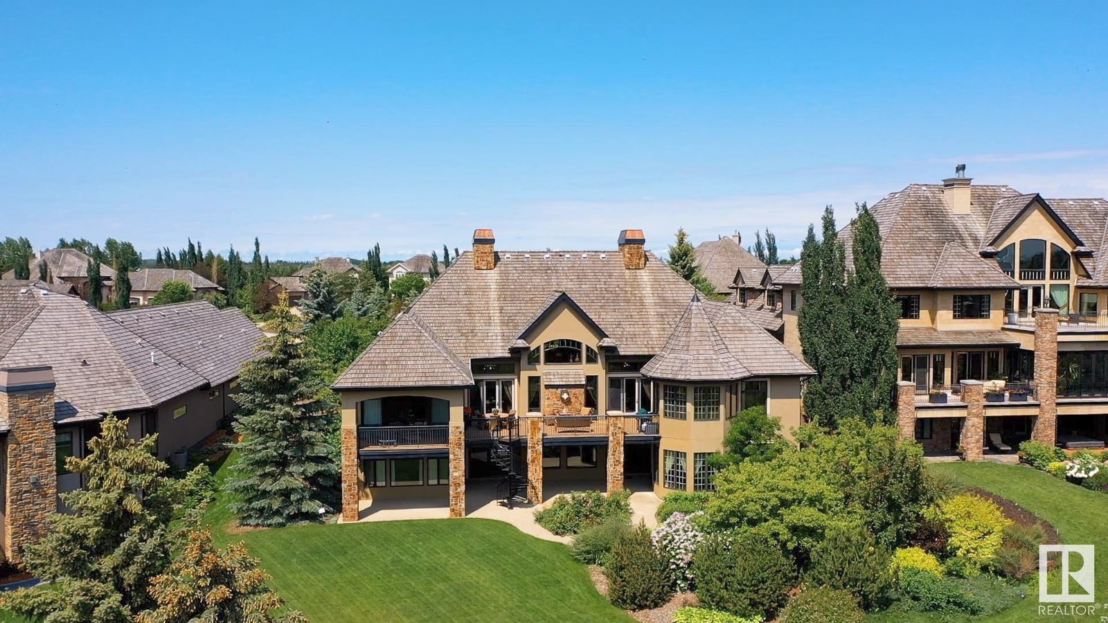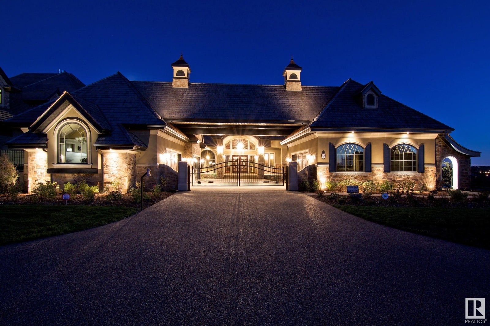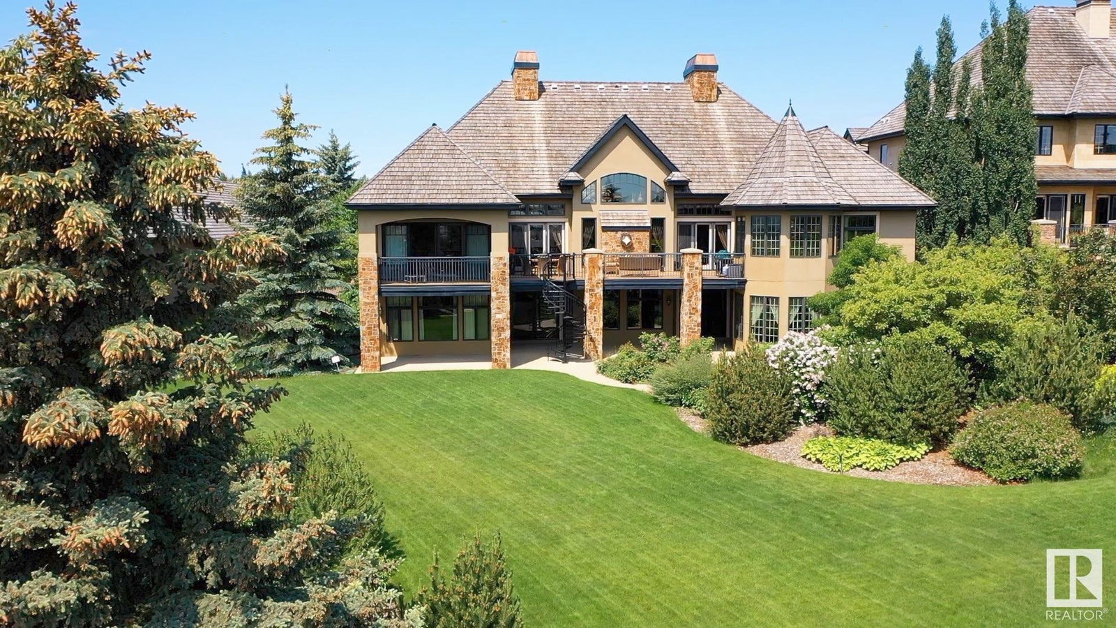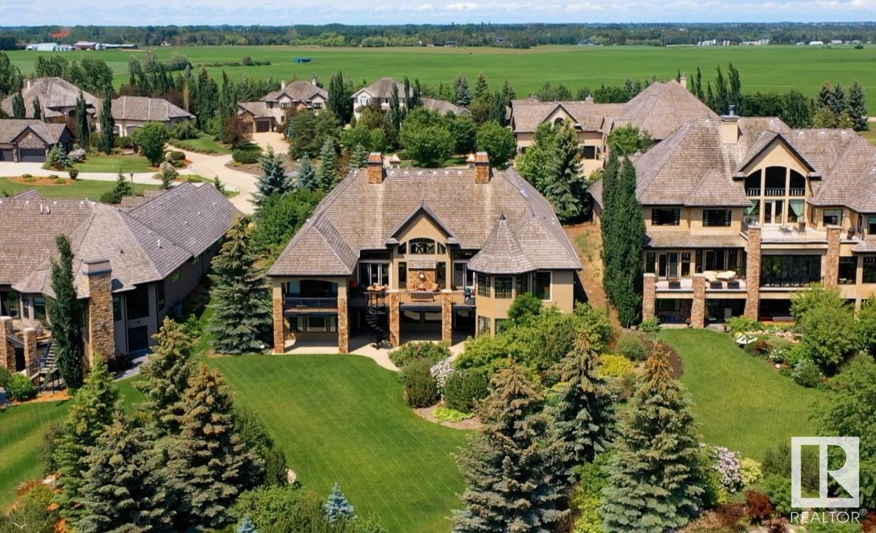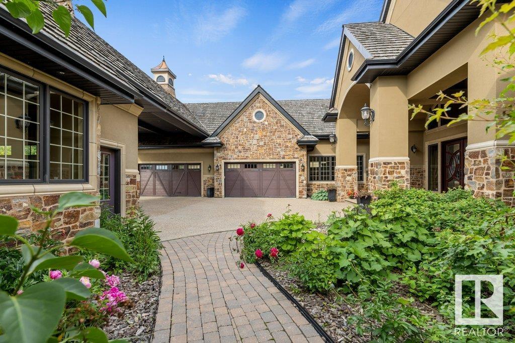 This STUNNING, Audie Benson Estate Homes show home is the grandest of the grand! 7100 sq ft of luxury living on 0.72 acres of gorgeous river valley views in prestigious Riverstone Pointe, minutes out of St. Albert & to the Anthony Henday. The curb appeal is unsurpassed with drive through portico, natural iron stone, copper chimneys & capolas & iron security gate. Step across the threshold into an elegant foyer w/views of the Great Room, boasting 20' open vaulted cherry ceilings, an exquisite formal dining room & music room, wall-to-wall & floor to ceiling library complete with sliding ladder. The den is perfectly situated off the luxurious master suite & library. This magnificent walkout bungalow boasts awards for best kitchen & best ensuite in North America. Main floor access to the south backing upper patio, with views of double waterfalls, bridges & rose gardens. The lower level includes a gathering room, games room, theatre, old world wine cellar, fitness room w/massage area, and SO MUCH MORE!