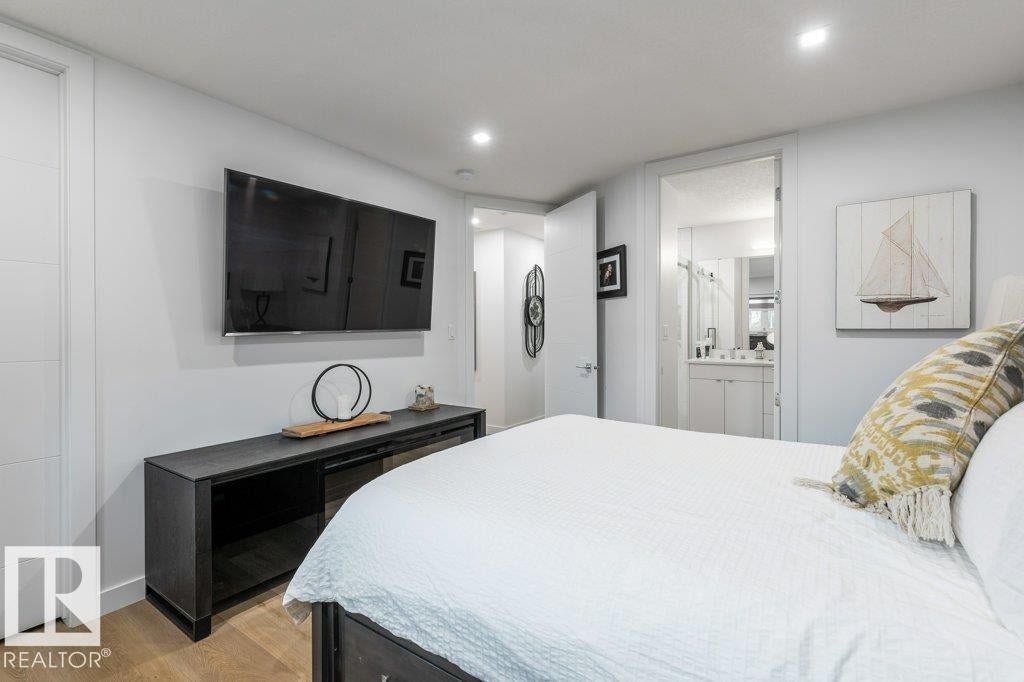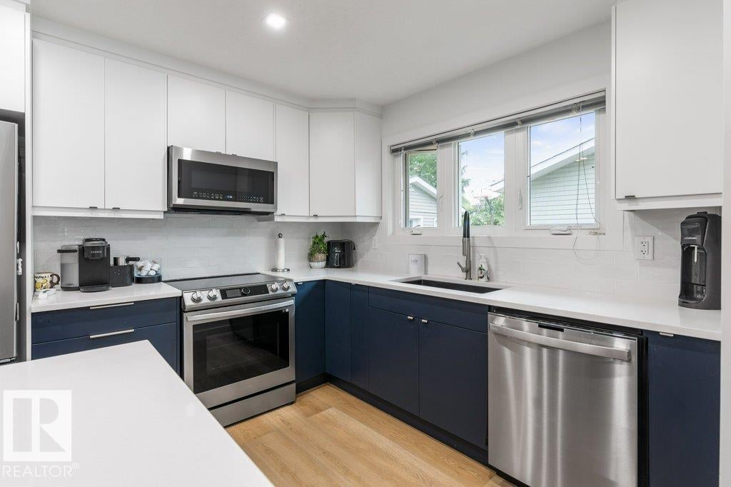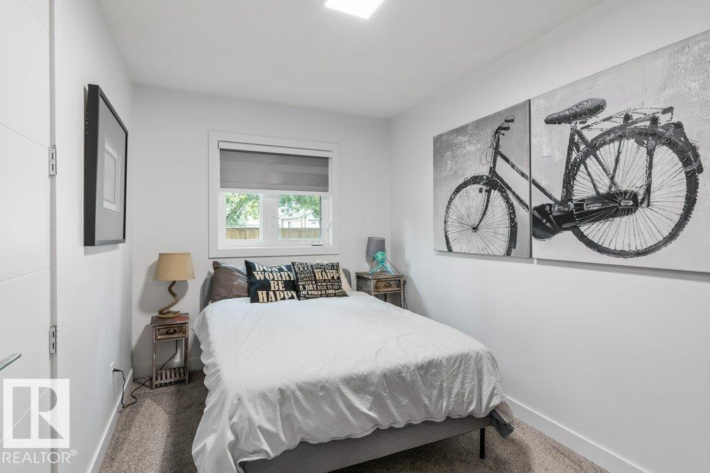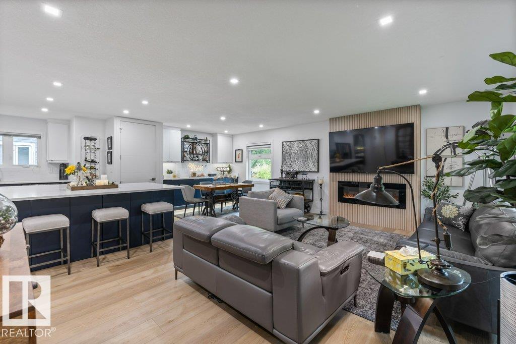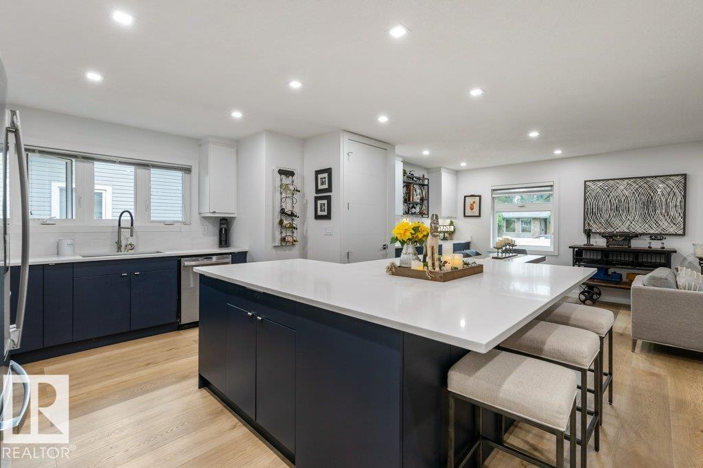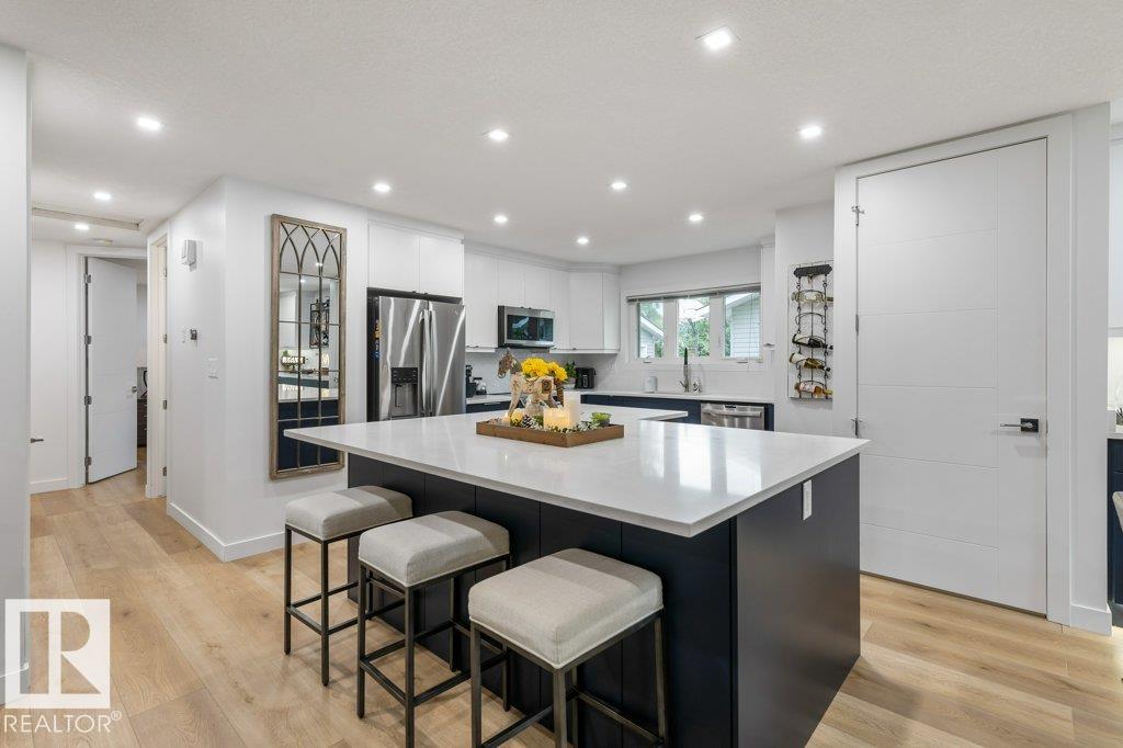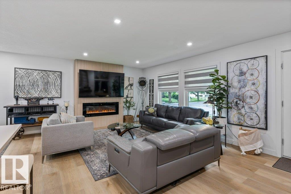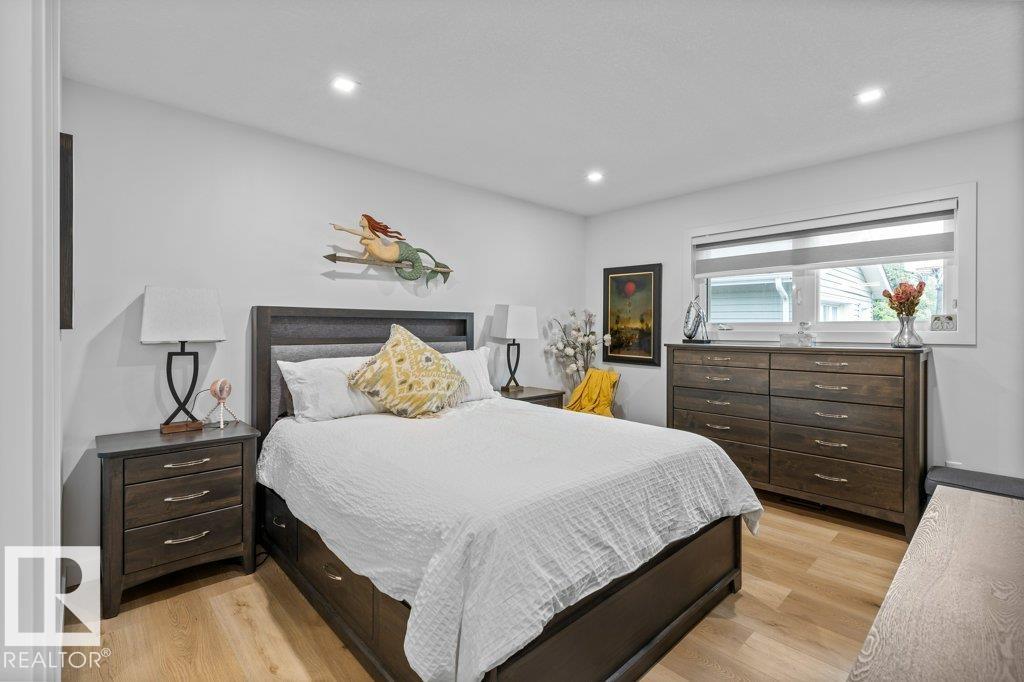 Discover the charm of Mission in St. Albert—a mature, family-friendly community. This beautifully renovated bungalow offers one of the largest floor plans in the area, with over 2,450 sq ft of total living space. Recent upgrades include vinyl plank flooring, triple-pane windows, updated roof, hot water tank, insulation, blinds, fence, and concrete work. The stunning kitchen features two-tone cabinetry, stainless steel appliances, and a spacious eat-up island. The cozy living room boasts a floor-to-ceiling wood feature wall with an electric fireplace. With 3 bedrooms and 2 full bathrooms on the main floor, including a stylish ensuite with dual sinks and a glass shower, there's space for the whole family. The fully finished basement offers a fourth bedroom, large rec room, 2-piece bath, and an incredible sauna. Situated on a desirable corner lot, this home also includes a heated oversized double garage, connected by a convenient breezeway.