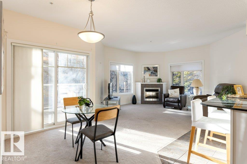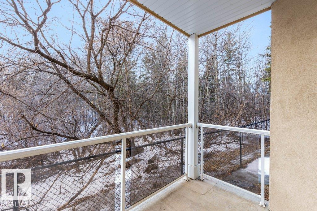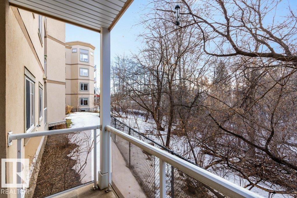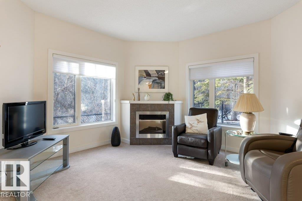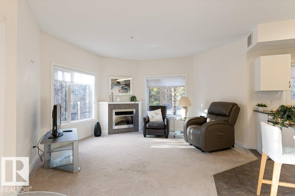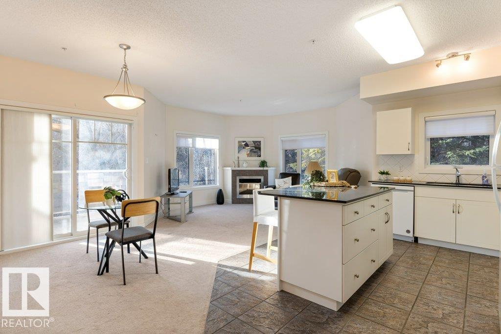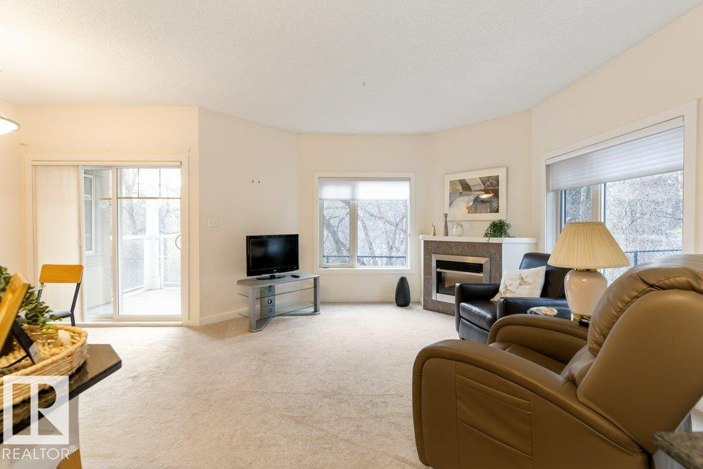 PRIVATE END UNIT with RAVINE FACING BALCONY!! Step into this inviting 1292 Sqft 2-bedroom plus Den, 2-bath, with in-suite Laundry, AC & plenty of storage. The kitchen boasts white cabinetry, granite counters, a pantry, & a huge island with a breakfast bar. The living room and dining areas have plenty of big windows providing lots of natural sunlight, a corner gas fireplace, & sliding doors to the balcony. The oversized primary bedroom boosts large walk-in closet, & full bath with double sized shower. The second bedroom is also a great size with walk in closet and a built-in Murphy bed. Need an office? The den has a beautiful built-in office. Heated Undergound parking, with a large storage room in front of the stall, plus 1 stall outside. Plenty of visitor parking. Excellent location close to shopping, transit, & easy access to all areas of St. Albert & Edmonton. If you're looking for a special place to live, then look no further, your new home is waiting.