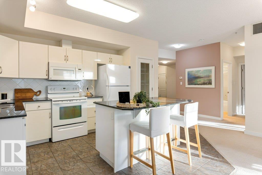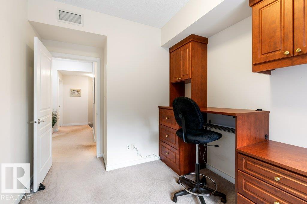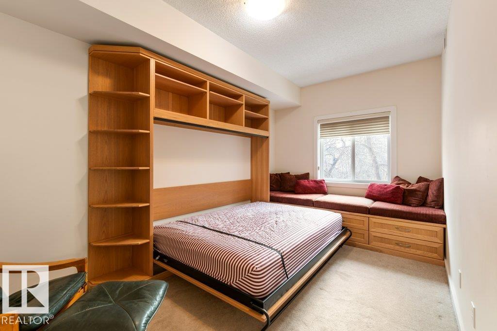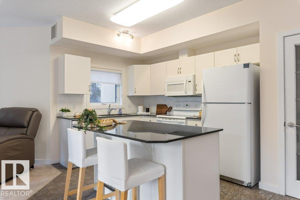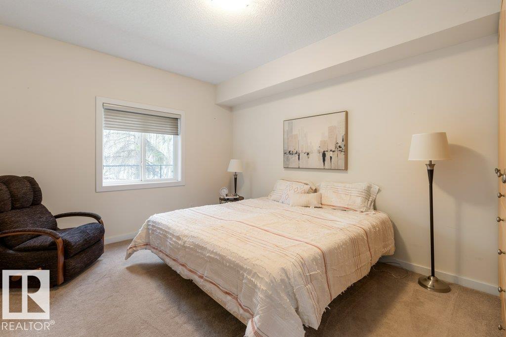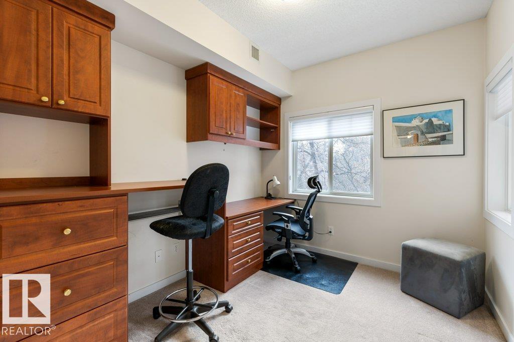 PRIVATE END UNIT with RAVINE FACING BALCONY!! Step into this inviting 1292 Sqft 2-bedroom plus Den, 2-bath, with in-suite Laundry, AC & plenty of storage. The kitchen boasts white cabinetry, granite counters, a pantry, & a huge island with a breakfast bar. The living room and dining areas have plenty of big windows providing lots of natural sunlight, a corner gas fireplace, & sliding doors to the balcony. The oversized primary bedroom boosts large walk-in closet, & full bath with double sized shower. The second bedroom is also a great size with walk in closet and a built-in Murphy bed. Need an office? The den has a beautiful built-in office. Heated Undergound parking, with a large storage room in front of the stall, plus 1 stall outside. Plenty of visitor parking. Excellent location close to shopping, transit, & easy access to all areas of St. Albert & Edmonton. If you're looking for a special place to live, then look no further, your new home is waiting.