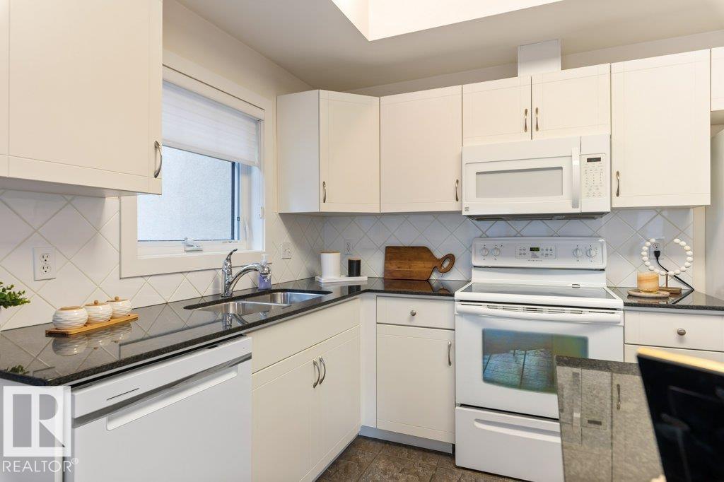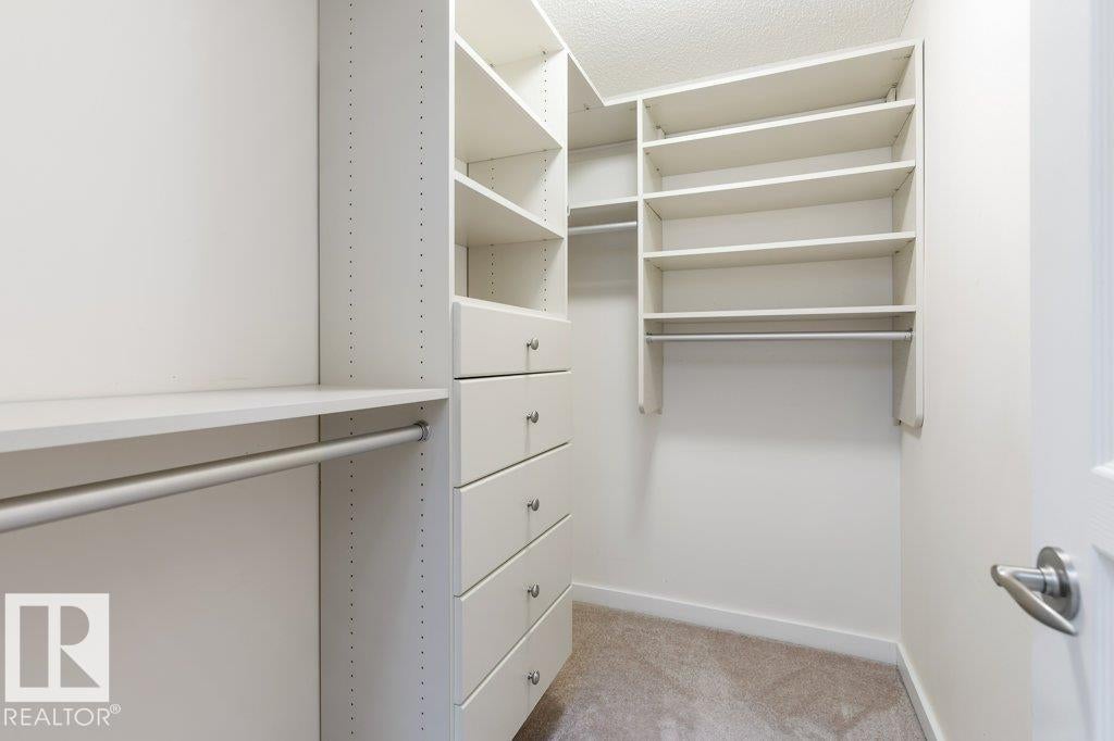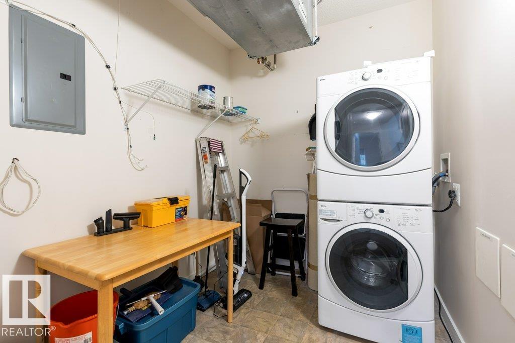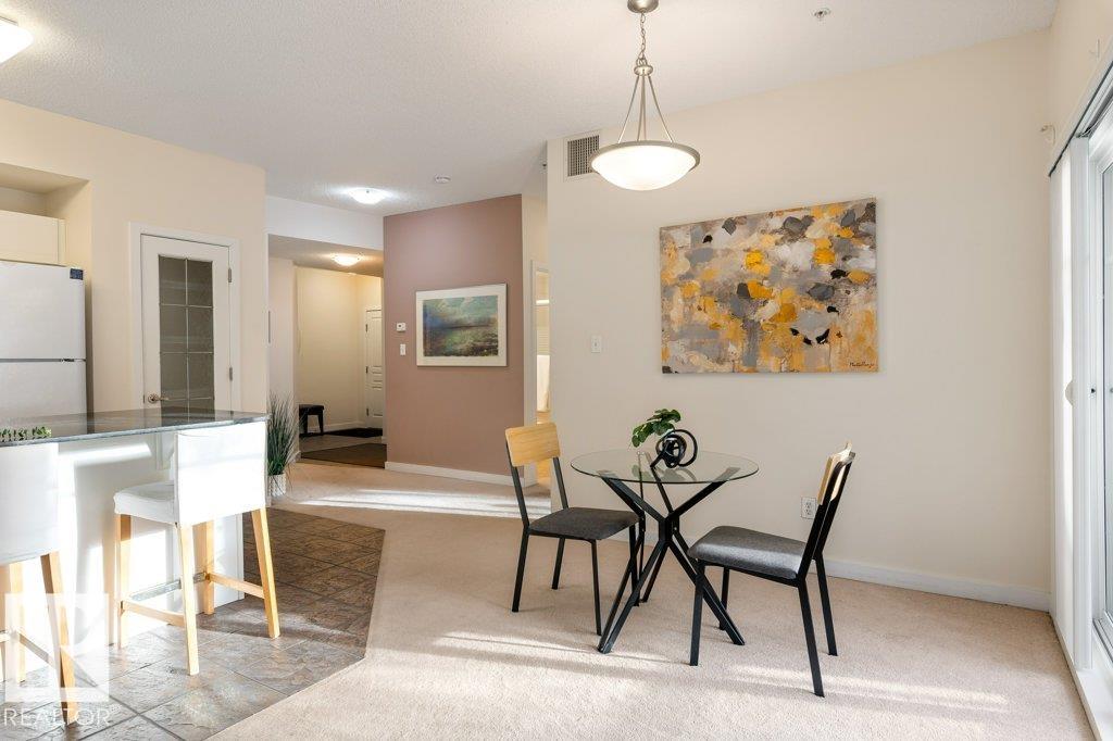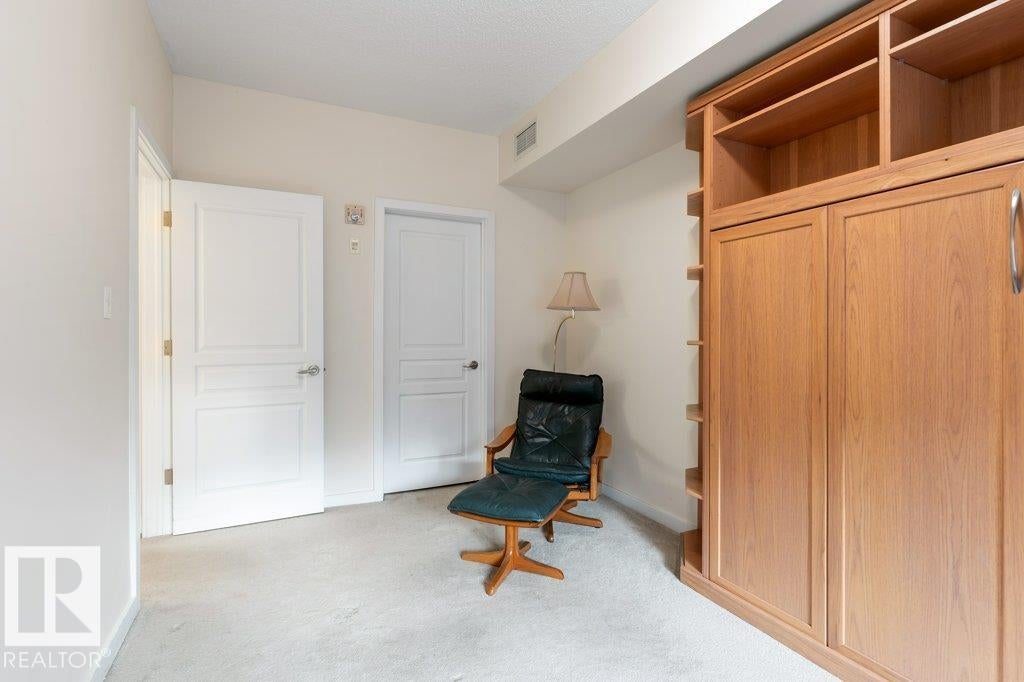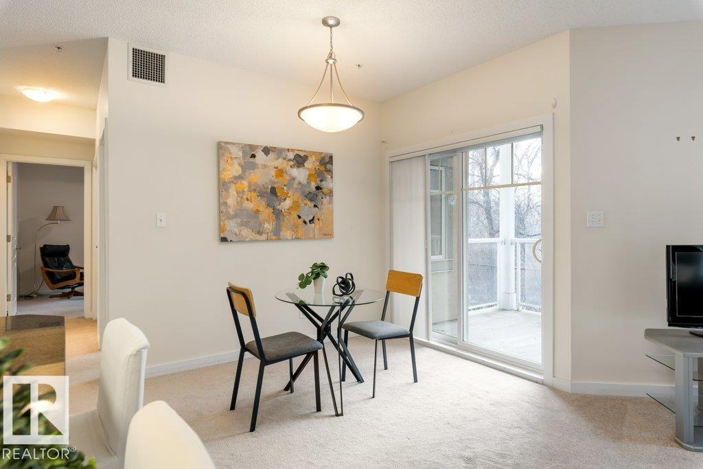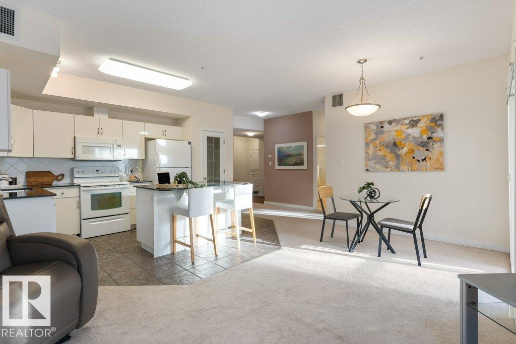 PRIVATE END UNIT with RAVINE FACING BALCONY!! Step into this inviting 1292 Sqft 2-bedroom plus Den, 2-bath, with in-suite Laundry, AC & plenty of storage. The kitchen boasts white cabinetry, granite counters, a pantry, & a huge island with a breakfast bar. The living room and dining areas have plenty of big windows providing lots of natural sunlight, a corner gas fireplace, & sliding doors to the balcony. The oversized primary bedroom boosts large walk-in closet, & full bath with double sized shower. The second bedroom is also a great size with walk in closet and a built-in Murphy bed. Need an office? The den has a beautiful built-in office. Heated Undergound parking, with a large storage room in front of the stall, plus 1 stall outside. Plenty of visitor parking. Excellent location close to shopping, transit, & easy access to all areas of St. Albert & Edmonton. If you're looking for a special place to live, then look no further, your new home is waiting.